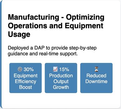 Solution: Deployed a DAP to provide step-by-step guidance and real-time support on equipment interfaces, tracking performance metrics.