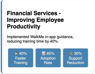 Solution: Implemented WalkMe in-app guidance, reducing training time by 40%.